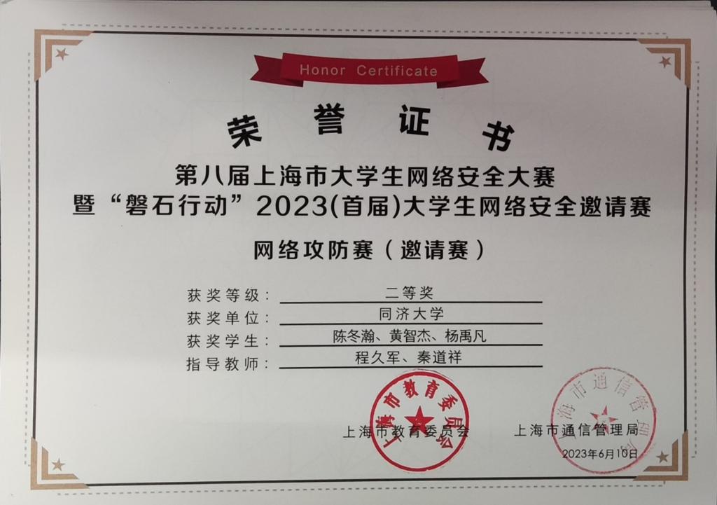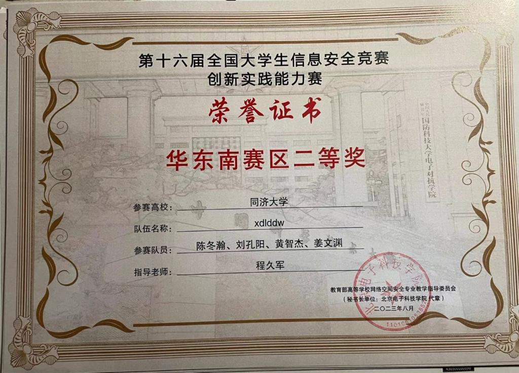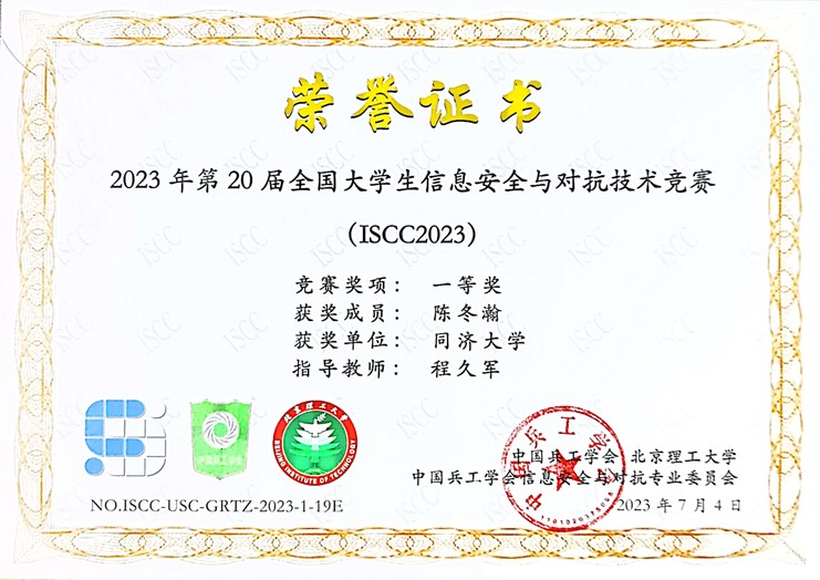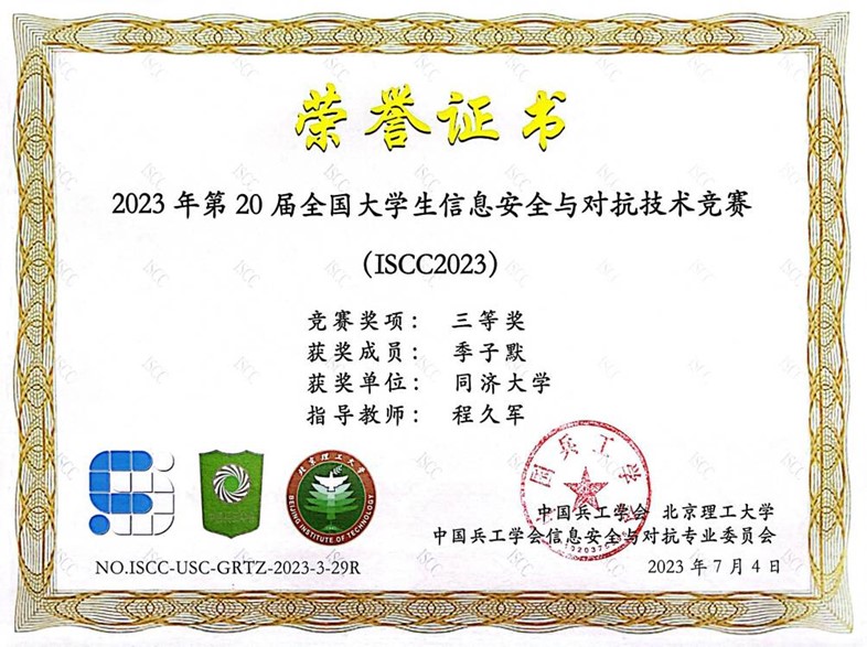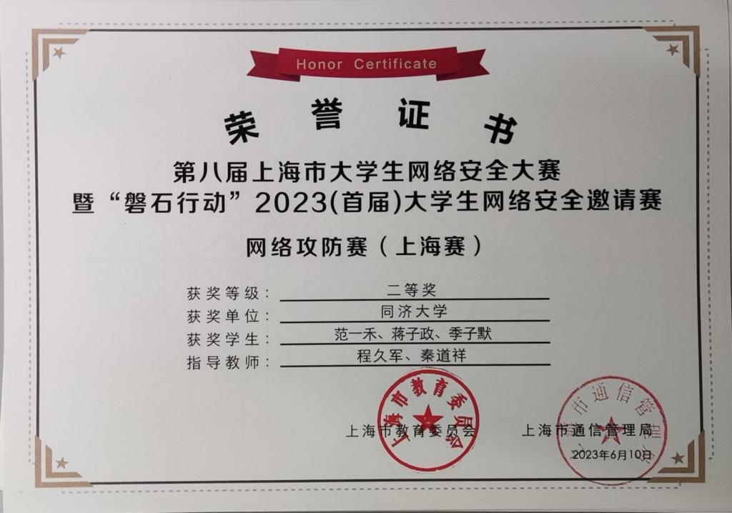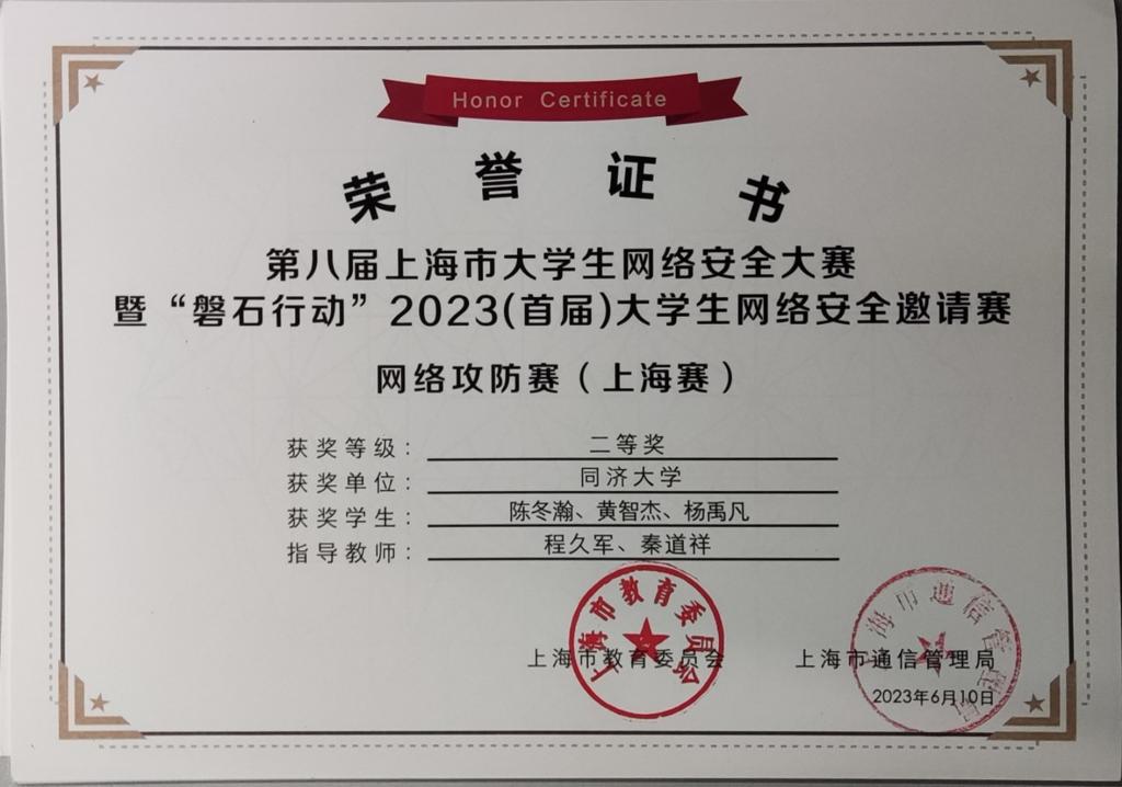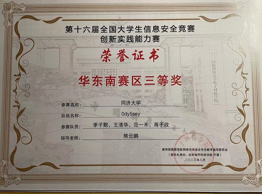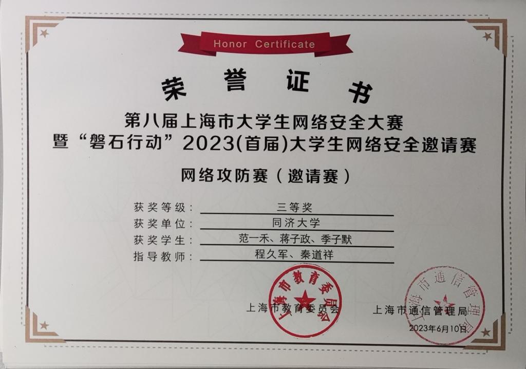 今年,在学院创新基地信息安全实验室的支持下,在学院计算机系程久军教授、校信息办秦道祥及熊云鹏老师的指导下,44118太阳成城集团网络安全战队CatTrainingForce的成员们分别在各类信息安全比赛中取得了优异成绩:2023第20届全国大学生信息安全与对抗技术竞赛(一等奖:陈冬瀚;三等奖:季子默);第16届全国大学生信息安全竞赛华东南分区网络安全攻防技术赛(二等奖:陈冬瀚、刘孔阳、姜文渊、黄智杰;三等奖:季子默、蒋子政、范一禾、王清华);第八届上海市大学生网络安全大赛暨“磐石行动”2023(首届)大学生网络安全邀请赛网络攻防赛(上海赛)(二等奖:陈冬瀚、杨禹凡、黄智杰;二等奖:季子默、蒋子政、范一禾);第八届上海市大学生网络安全大赛暨“磐石行动”2023(首届)大学生网络安全邀请赛网络攻防赛(邀请赛)(二等奖:陈冬瀚、杨禹凡、黄智杰;三等奖:季子默、蒋子政、范一禾)。( 文/陈冬瀚    图/季子默 )