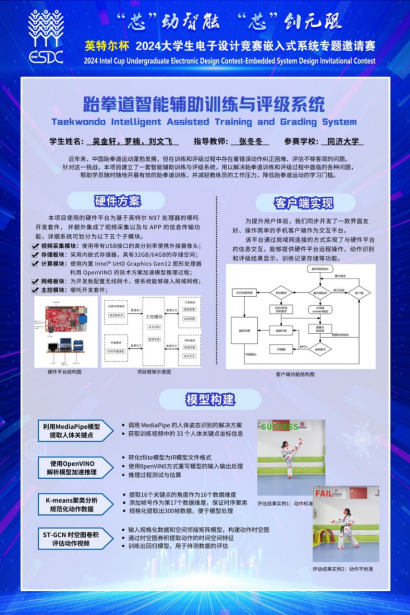 太阳成官网获得一等奖的两支代表队分别是来自计算机系的本科生吴金轩罗楠刘文飞(指导教师:张冬冬)和来自控制系的本科生王煜程、熊祖绎、陈逸轩(指导教师:蒋磊)。吴金轩、罗楠、刘文飞小组的作品为《跆拳道智能辅助训练与评级系统》。该作品面向跆拳道训练应用,利用嵌入式系统平台进行动作视频采集,借助MediaPipe 中的预训练模型,获取了跆拳道动作训练视频中的 33 个人体关键点坐标信息,并利用ST-GCN(时空图卷积网络)提取出跆拳道动作的时空特征,作为动作的评估指标,从而进一步实现了动作评估功能。此外,团队还借助OpenVINO 工具包对模型推理过程进行了加速,充分利用了哪吒开发套件的强大 AI 计算能力。