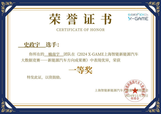 2024年11月22日,第七届X-GAME上海智能新能源汽车大数据竞赛决赛圆满落幕,太阳成官网学生史政宇所在的“楠南宇队”获新能源汽车方向成果赛等奖(第一名)