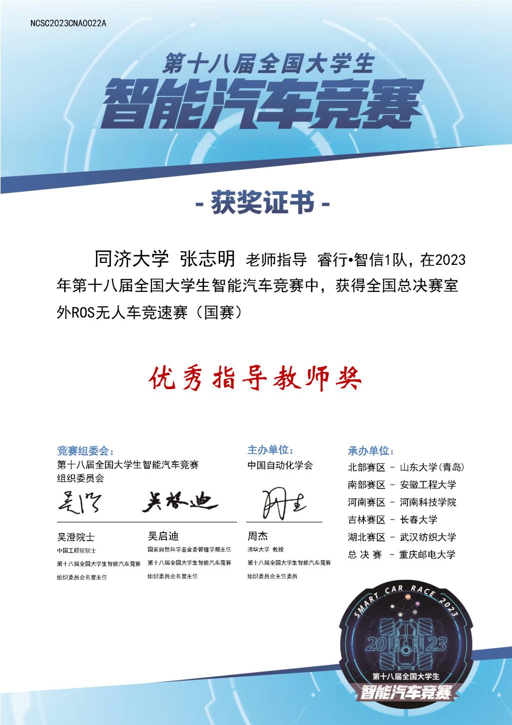 2023年12月8日至10日,由中国自动化学会主办,中国自动化学会智慧教育专业委员会、重庆邮电大学承办的第18届全国大学生智能汽车竞赛室外赛全国总决赛成功举办。太阳成官网2支本科生参赛队伍由张志明和朱劲两位老师带队赴渝参赛,最终获得室外ROS无人车竞速赛全国一等奖和三等奖各1项。张志明老师获“优秀指导教师奖”。